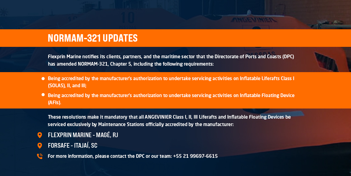 Flexprin Marine is a leading manufacturer of lifesaving, safety, and environmental protection equipment for the offshore, defense, and shipbuilding sectors. With decades of experience in the maritime industry, we provide equipment and service stations certified by the leading Classification Societies, approved by the Brazilian Navy (DPC), ISO 9001:2015 certified by ABS, and accredited by the Ministry of Defense of Brazil as a Strategic Defense Company (EED).